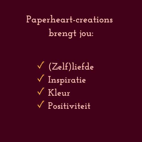 Dat is waar Paperheart-creations voor staat. Het positief herinneren aan het moois in alledaagse dingen. Ik zet mijn hart op papier en creëer met liefde. Op een toegankelijke manier. Paperheart-creations biedt items aan in een betaalbaar segment. Voor ieder wat wils! Zit er niet precies tussen waar je naar op zoek bent? Neem contact op met mij en we bespreken samen de wensen en kijken hoe ik iets moois voor je kan creëren!