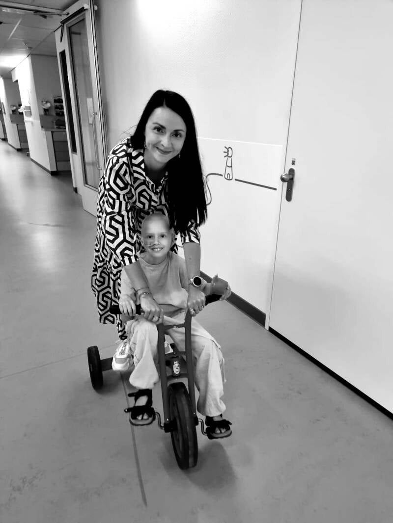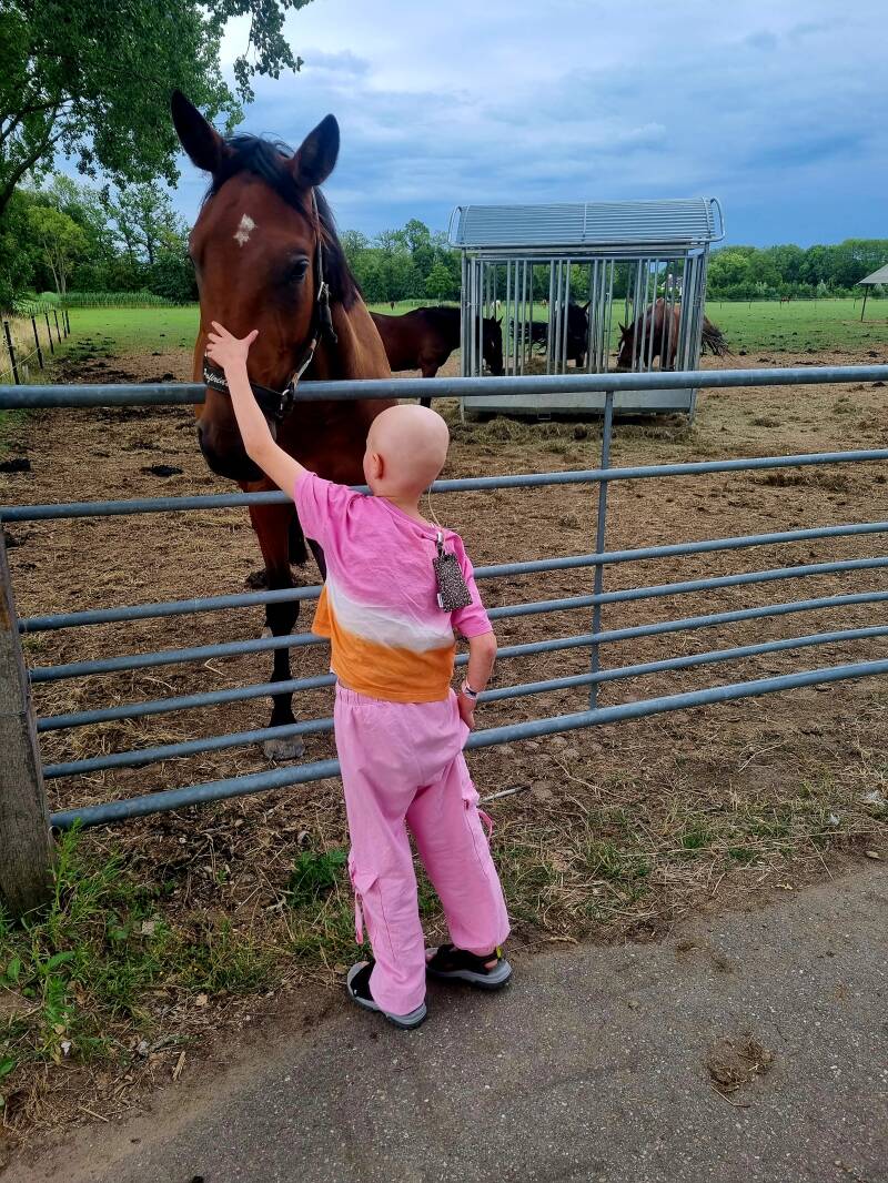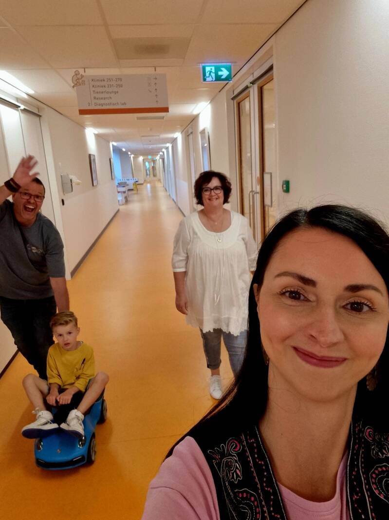 Terwijl we op de regenboogbrug stonden kwam het besef, waar is Liv? Iedereen in rep en roer. Baliemedewerksters, artsen, verpleegsters.. Iedereen hielp met zoeken. Uiteindelijk kwam ze het hoekje omgefietst. Ze was er nog niet klaar voor. Een teken van haar om haar schrap te zetten. Een teken voor ons om extra voorzichtig te zijn met haar. Liv vond het erg spannend. Was bang om scheef te lopen met maar één nier. Dat je dan uit evenwicht bent. Vond het ook erg zielig voor de nier. Maar die inbreker moest eruit. Daar was ze het wel mee eens.