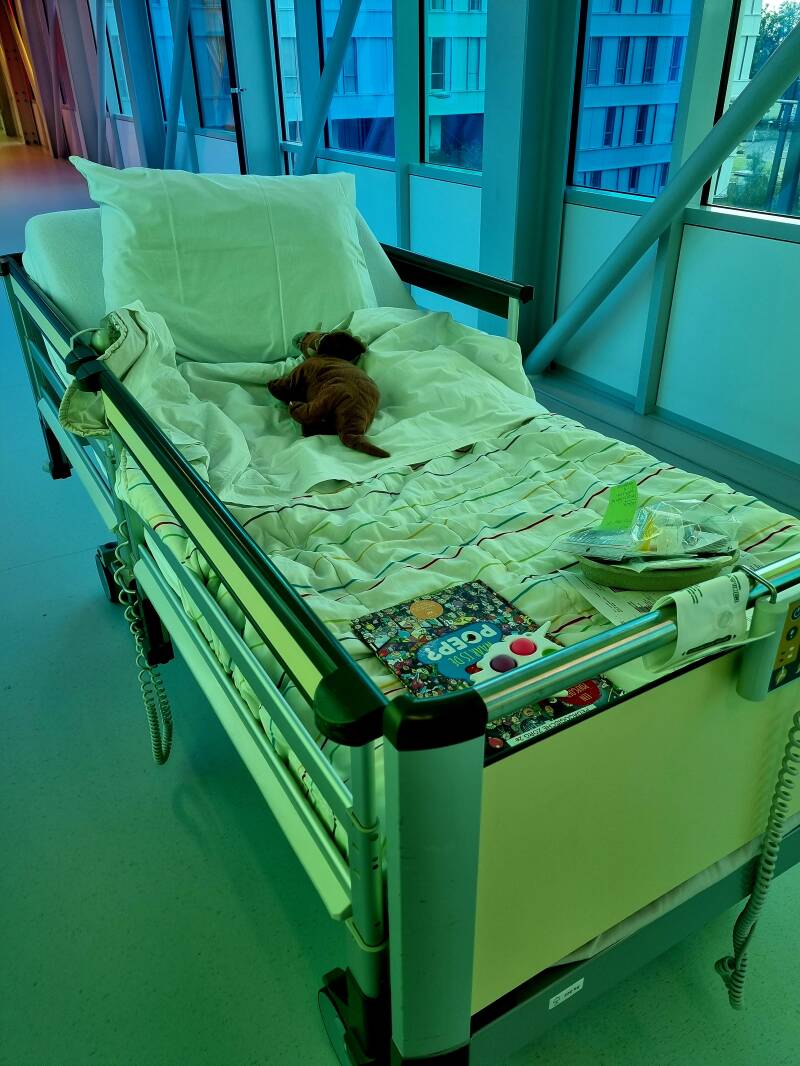 De operatie verliep goed. Bas en ik hebben nog wat ontbeten samen en we probeerden een puzzel te maken in de tussentijd, maar we kwamen niet verder dan de randjes. Toen kregen we het telefoontje al dat Liv op de uitslaapkamer was. Omdat het zo rustig was mochten we er beiden bij zijn. Dit was erg fijn. Liv mocht op haar eigen tempo wakker worden en was vrij snel alweer alert. Wel moesten er nog wat controles worden uitgevoerd waardoor we een uurtje later naar de kamer mochten. Ze moest deze keer vaker spugen door de narcose dan normaal. *Bizar dat we het hebben over een normaal, maargoed..*