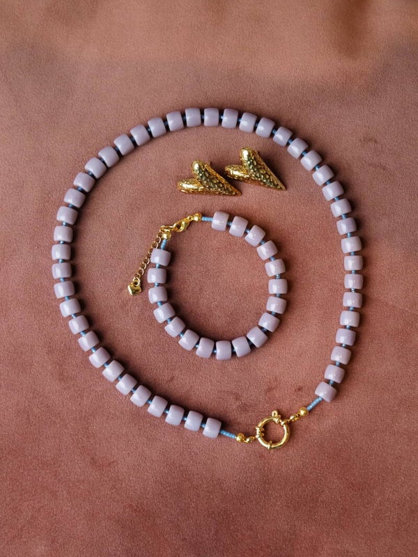 De nieuwe set met rondelle ketting en armband is te combineren met goudkleurige oorbellen. Heel leuk en speels als set, maar ook leuk om te combineren met andere armbanden met andere vormen en kleuren. De kleurencombinatie paars met blauw is helemaal van nu en past perfect bij de denim trend van dit moment!